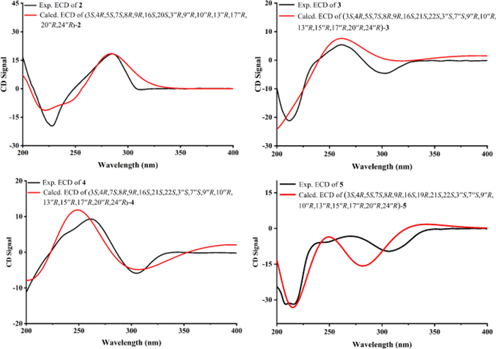 To further evaluate the configuration at C-3′′, DP4 analysis was performed for the two possible isomers. The DP4 results (Fig. 3) indicated that the population of 1a was 100%, whereas that of 1b was 0%, suggesting that the configuration at C-3′′ in 1 was R configuration. Subsequently, density functional theory (DFT) calculations at the B3LYP/6–311 + G(d, p) level in methanol were carried out for (3S, 4R, 5S, 7S, 8R, 9R, 16S, 20S, 3′′R, 9′′R, 10′′R, 13′′R, 17′′R, 20′′R, and 24′′R)-1, and the calculated ECD spectrum was compared with the experimental one. The results (Fig. 4) showed that the calculated and experimental ECD spectra exhibited good agreement. The absolute configuration of 1 was thus assigned as 3S, 4R, 5S, 7S, 8R, 9R, 16S, 20S, 3′′R, 9′′R, 10′′R, 13′′R, 17′′R, 20′′R, and 24′′R.