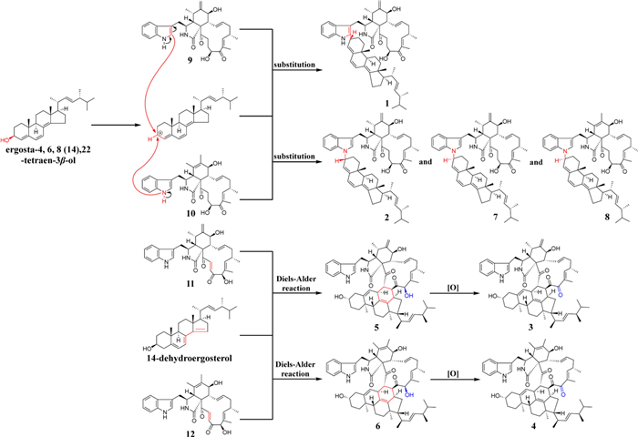 The possibility of an artificial reaction between chaetoglobosins and ergosterol analogues was evaluated. In these model experiments, cholesterol, which shared a similar structure with ergosta-4, 6, 8(14), 22-tetraen-3β-ol, and chaetoglobosin Fex were used. Equimolar mixtures of the two compounds were stirred at 55 ℃ for 12 h in methanol: dichloromethane solvents (1:0, 1:1, and 0:1, v/v). Thin-layer chromatography (TLC) analysis of the resulting mixtures revealed no significant formation of new products. Due to the lack of available ergosterol derivatives structurally similar to 14-dehydroergosterol, further experimental evaluation of the Diels–Alder cycloaddition pathway could not be conducted. Given the rarity of enzymatic nucleophilic substitution involving alcohols at the C-1′ or C-2′ positions of indole rings, compounds 1, 2, 7 and 8 were more likely biosynthesized through non-enzymatic pathways. Although the Diels–Alder cycloaddition represents a well-known class of natural product cyclizations, only a limited number of enzymes capable of catalyzing this reaction have been identified. Thus, the formation of 3, 4, 5, and 6 were also presumed to proceed via non-enzymatic mechanisms.