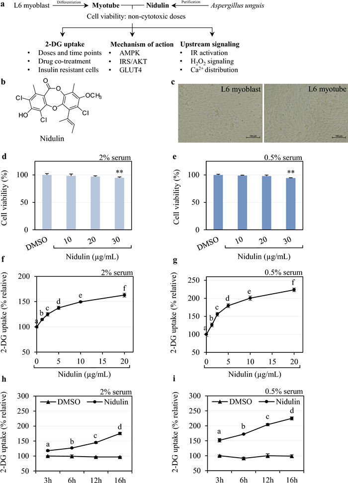 Effect of nidulin on 2-DG uptake in L6 myotubes. a Schematic diagram of the study. L6 myoblasts were differentiated to myotubes. The cells were treated with nidulin purified from A. unguis to determine the non-cytotoxic levels of nidulin. The effect of nidulin on 2-DG uptake and its mechanisms of action were investigated in the present study. b The structure of nidulin. c Representative microscope images (200 × total magnification) of L6 myoblasts and myotubes. d and e The number of viable L6 myotubes after 10, 20, and 30 µg/mL nidulin treatment for 18 h in differentiation medium containing 2% and 0.5% horse serum (HS), respectively. f and g Dose-dependent effects of nidulin on 2-DG uptake in differentiation medium containing 2% and 0.5% HS, respectively. Cells were treated with 1.25, 2.5, 5, 10, and 20 µg/mL nidulin for 16 h. h and i Time-dependent effects of nidulin (20 µg/mL) on 2-DG uptake in medium with 2% and 0.5% HS, respectively. Cells were treated for 3, 6, 12, and 16 h. Following treatment, a 2-DG uptake assay was performed. DMSO served as the vehicle control. Data are presented as relative values (%) and expressed as mean ± S.D. (n = 4 per group). Similar results were obtained from the multiple experiments. Significant differences compared to corresponding controls: **p < 0.01. Different letters denote statistically significant differences (p < 0.05)