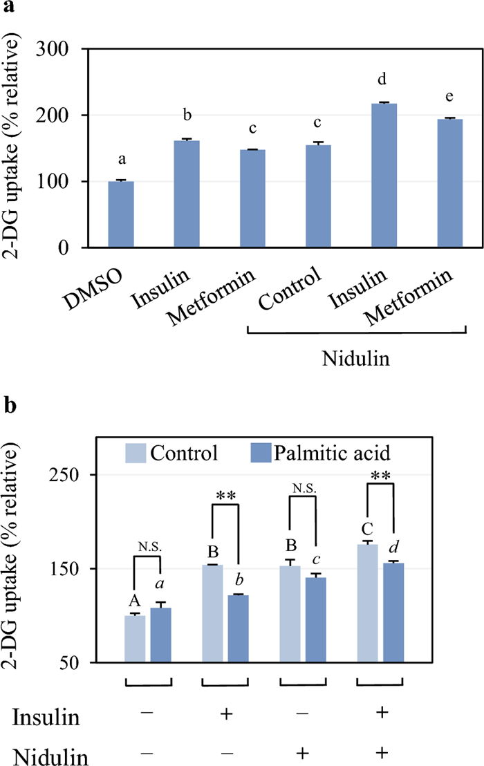 Effect of nidulin during drug treatment and under insulin resistance. a 2-DG uptake in the presence of insulin or metformin. L6 myotubes were treated with 20 µg/mL nidulin for 16 h, followed by 100 nM insulin treatment for 30 min, or co-treated with 1 mM metformin and 20 µg/mL nidulin for 16 h. A 2-DG uptake assay was performed after treatment. DMSO served as the vehicle control. b 2-DG uptake in palmitic acid-induced insulin resistance. Cells were treated with 125 µM palmitic acid and/or 20 µg/mL nidulin as indicated for 16 h. Vehicle controls were 50% EtOH (v/v) for palmitic acid and DMSO for nidulin. Where indicated, cells were stimulated with 100 nM insulin for 30 min prior to 2-DG uptake assay. Data are presented as relative 2-DG uptake (%) and expressed as mean ± S.D. (n = 4 per group). Similar results were obtained from the multiple experiments. Comparisons between the control group (no palmitate) and the palmitic acid-treated group were made. N.S., not significant; **p < 0.01. Comparisons within the control and palmitate-treated groups are indicated by capital and italic letters, respectively. Different letters denote statistically significant differences (p < 0.05)