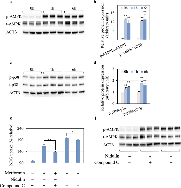 Effect of nidulin on the AMPK signaling pathway. a Immunoblot analysis of phosphorylated AMPK (p-AMPK), total AMPK (t-AMPK), and ACTβ as the loading control. b Quantification of p-AMPK levels normalized to t-AMPK and ACTβ. c Immunoblot analysis of phosphorylated p38 (p-p38), total p38 (t-p38), and ACTβ. d Quantification of p-p38 levels normalized to t-p38 and ACTβ. e Effect of AMPK inhibition on nidulin-stimulated 2-DG uptake. f Immunoblot analysis of p-AMPK, t-AMPK, and ACTβ in co-treatment of nidulin and compound C. L6 myotubes were treated with 20 µg/mL nidulin for 1 and 6 h. For inhibition studies, cells were pretreated with compound C for 1 h, then co-treated with nidulin and metformin as indicated for 3 h prior to 2-DG uptake assay and immunoblot analysis. DMSO, EtOH, and H2O were used as vehicle controls for nidulin, compound C, and metformin, respectively. Data are shown as relative 2-DG uptake (%) and expressed as mean ± S.D. (n = 3-4 per group). Similar results were obtained from the multiple experiments. Significant differences compared to the respective controls: *p < 0.05; **p < 0.01