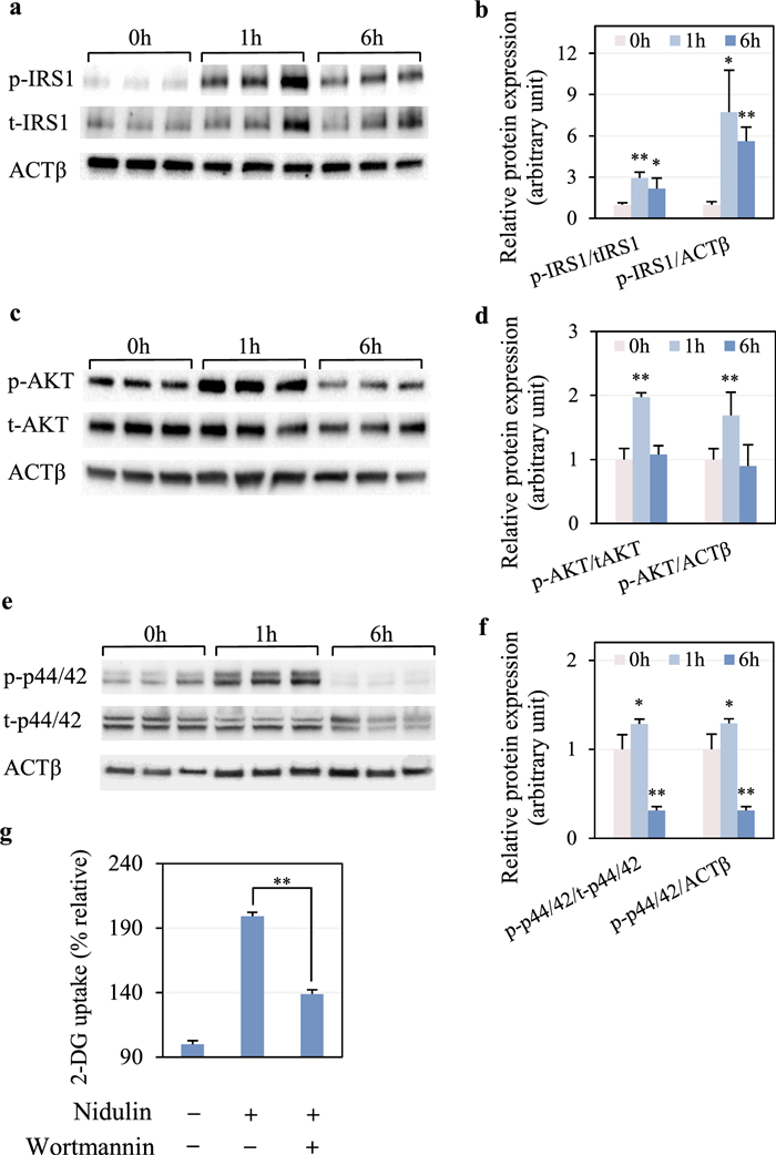 To determine whether nidulin promotes glucose uptake through the insulin signaling cascade, the activation status of key signaling proteins, including IRS1, AKT, and p44/42, was examined following nidulin treatment at 1 and 6 h. As shown in Fig. 4a, nidulin significantly increased IRS1 phosphorylation. The ratio of p-IRS1 to t-IRS1 rose by 2.93-fold at 1 h and 2.16-fold at 6 h, relative to the untreated control (Fig. 4b). Comparable results were observed when normalized to ACTβ, indicating sustained IRS1 activation. Nidulin also stimulated AKT phosphorylation (Fig. 4c). At 1 h, p-AKT levels were significantly increased both normalized to t-AKT and ACTβ (Fig. 4d). Nidulin-stimulated p-AKT was enhanced distinctly up to 4 h (Fig. S2). However, this activation was transient, returning to baseline by 6 h. Similarly, p-p44/42 was stimulated by nidulin treatment (Fig. 4e). After 1 h, the ratio of p-p44/42 to t-p44/42 and ACTβ both increased by 1.29 folds, but diminished by 6 h, paralleling the AKT response (Fig. 4f). One may argue that the basal levels of p-p44/42 could be dynamic in the untreated conditions, but no change in p-p44/42 was observed in non-treatment among 0, 1, and 6 h (Fig. S3). To confirm the functional role of insulin signaling in nidulin-stimulated glucose uptake, cells were pretreated with wortmannin, a PI3K/AKT pathway inhibitor. As shown in Fig. 4g, wortmannin significantly attenuated nidulin-induced 2-DG uptake, reducing uptake from 199 to 138% compared to control.