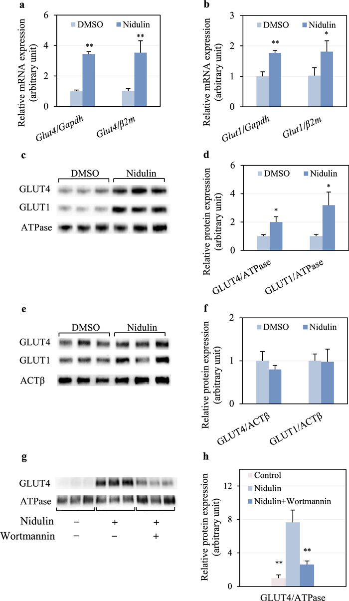 Stimulatory role of nidulin in GLUT4 and GLUT1 mRNA expression and translocation. a mRNA expression levels of GLUT4 normalized to GAPDH and β2M. b mRNA expression levels of GLUT1 normalized to GAPDH and β2M. c Immunoblot analysis of GLUT4, GLUT1, and Na+/K+ ATPase (ATPase) in the plasma membrane fraction. d Densitometric analysis of membrane-associated GLUT4 and GLUT1 normalized to ATPase. e Immunoblot analysis of GLUT4, GLUT1, and ACTβ in the cytosolic fraction. f Densitometric analysis of cytosolic GLUT4 and GLUT1 normalized to ACTβ. g Immunoblot analysis of membrane GLUT4 and ATPase in the presence of wortmannin. h Densitometric analysis of membrane-associated GLUT4 normalized to ATPase. L6 myotubes were treated with 20 µg/mL nidulin for 3, 9, and 16 h for inhibition assays, gene expression, and protein analysis, respectively. DMSO and EtOH were used as vehicle controls for nidulin and wortmannin, respectively. Gene expression was analyzed by qPCR using the 2−ΔΔCT method. Membrane and cytosolic proteins were fractionated and detected via immunoblotting. Data represent mean ± S.D. (n = 3-4 per group). Similar results were obtained from the multiple experiments. Significant differences compared to the respective controls: *p < 0.05; **p < 0.01
