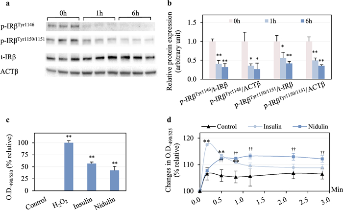 Upstream insulin signaling responses to nidulin. a Immunoblot analysis of phosphorylated insulin receptor β subunit at Ser307 (p-IRβSer307) and Tyr1150/1151 (p-IRβTyr1150/1151), total IRβ (t-IRβ), and ACTβ. b Quantitative analysis of protein bands in A. L6 myotubes were treated with 20 µg/mL nidulin for 1 and 6 h. c Intracellular H2O2 levels detected using AbGreen. Cells were treated with 100 µM H2O2 and 10 nM insulin for 20 min, and 20 µg/mL nidulin for 1 h. Fluorescence detection was measured at O.D.490/520. and presented as relative fluorescence intensity (%) compared to 100 µM H2O2. d Cytosolic free Ca2+ content measured by Fluo-8. Cells were preloaded with the dye, followed by treatment with 100 nM insulin or 20 µg/mL nidulin. Fluorescence emission was recorded at O.D.490/525 every 30 s for 3 min. Data represent relative changes (%) in fluorescence intensity. DMSO served as the vehicle control. Results are shown as mean ± S.D. (n = 3–5 per group). Similar results were obtained from the multiple experiments. Significant differences compared to control: ††p < 0.01 for nidulin; **p < 0.01 for insulin