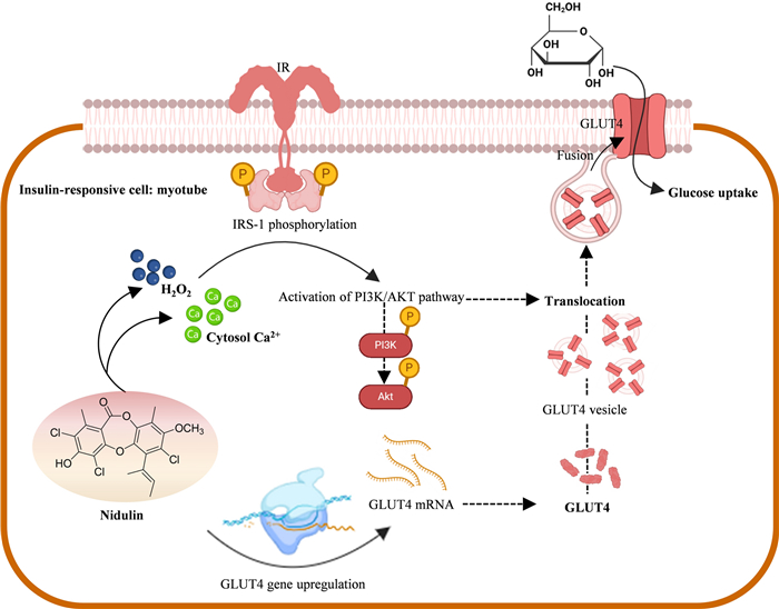 This study demonstrates that nidulin, a trichlorinated fungal depsidone, significantly enhances glucose uptake in L6 myotubes under both insulin-sensitive and insulin-resistant conditions. Nidulin promotes GLUT4 translocation primarily via activation of the PI3K/AKT signaling pathway. In particular, nidulin-induced redox and Ca2+ signaling act as upstream modulators of this pathway, partially mimicking certain aspects of insulin action despite bypassing insulin receptor activation. Additionally, this fungal metabolite upregulates Glut4 and Glut1 expression and restores glucose uptake impaired by palmitate-induced insulin resistance. It is important to evaluate the glycemic control effects of nidulin in animal models. Although in vivo studies on depsidone metabolites remain limited, previous reports have demonstrated well tolerability of these compounds in animals [48, 49]. In line with these findings, nidulin emerges as a promising candidate for further investigation in models of insulin resistance and T2D. This study suggests that nidulin partially mimics insulin action holding potential as a novel insulin-sensitizing agent, highlight the potential of nidulin as an adjunctive therapy for insulin resistance and T2D.