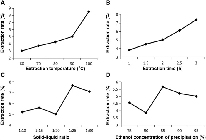 Therefore, the conditions for the optimal extraction rate of SYB by single-factor test were extraction temperature of 100 ℃, time of 3 h, alcohol precipitation concentration of 85%, and solid–liquid ratio of 1:25 (g/mL).