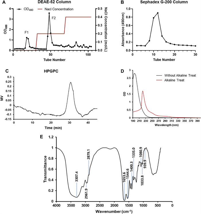 The preparation and physicochemical properties of SYB-1. A Crude SYB elution profile on a DEAE-52 column. B Purification of SYB-1 on a Sephadex G-200 column. C HPGPC profile. D The UV spectrum. E The IR spectrum