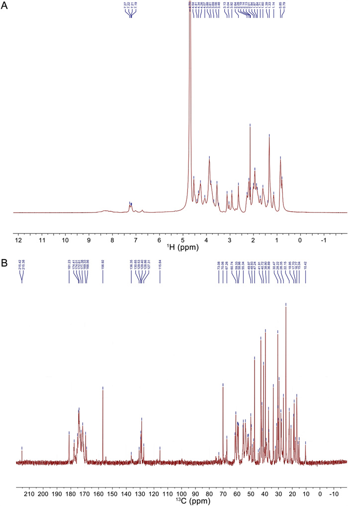 The 1H and 13C NMR spectra provide critical insights into the structural properties of SYB-1. The signal assignment of amino acid residues in the 1H and 13C NMR spectra (Fig. 3) took advantage of Biological Magnetic Resonance Data Bank (BMRB) [29], and the results of signal attribution are shown in Tables 3, 4.