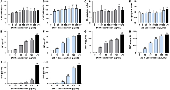 Immunomodulatory activity of SYB and SYB-1 on macrophages RAW 264.7 in vitro. A, B Cell viability: SYB (A), SYB-1 (B). C, D Phagocytosis index: SYB (C), SYB-1 (D). E, F NO release: SYB (E), SYB-1 (F). G, H TNF-α release: SYB (G), SYB-1 (H). I, J IL-6 release: SYB (G), SYB-1 (H). * and ** represent p < 0.05 and p < 0.01 compared with control, respectively