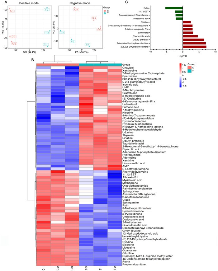Differentially accumulated metabolites (DAMs) between the SYB-1-treated groups (T group) and the control groups (C group) were investigated. The PCA analysis indicates that SYB-1 treatment greatly altered the metabolites of RAW264.7 cells, which remained stable in the same groups (Fig. 5A). DAMs with significant differences were defined as metabolites with a p < 0.05 and a variable importance for the projection (VIP) value > 1. Metabolites with positive and negative Log2FC were found to be up-regulated DAMs and down-regulated DAMs, respectively, following screening under the aforementioned criteria. In all, 71 DAMs were found in this investigation (Fig. 5B), of which 34 were down-regulated, and 37 were up-regulated. Further screening for DAMs with large |Log2FC| at a threshold of 2 resulted in eight up-regulated DAMs: 20a,22b-dihydroxycholesterol, adenosine 5'-phosphate disodium, dibutyl phthalate, taurocholic acid, lathosterol, 6-keto-prostaglandin F1a, 2-hexaprenyl-6-methoxy-1,4-benzoquinone, and nicotine; four down-regulated DAMs: Rutin, 11,12-EET, docosatetraenoyl ethanolamide, and undecanoic acid (Fig. 5C).