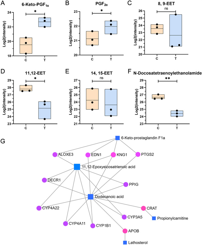 Metabolites associated with arachidonic acid metabolism in metabolomics. A–F Variations in metabolites associated with arachidonic acid metabolism, including 6-keto-PGF1α (A), PGF2α (B), 8,9-EET (C), 11,12-EET (D), 14,15-EET (E), N-Docosatetraenoylethanolamine (F). G DAMs-gene interaction network. *, **, and ns represent p < 0.05, p < 0.01 and p > 0.05 compared with control, respectively