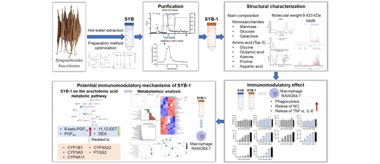 Syngnathoides biaculeatus, a potential functional food from marine sources, was found to enhance nonspecific immunity, but its functional ingredients have rarely been reported. Therefore, this study focused on the preparation and physicochemical properties of its water-soluble natural ingredients with their immunomodulatory activities and potential mechanisms. Firstly, we optimized the extraction method of glycoproteins from S. biaculeatus and prepared the crude glycoprotein SYB, from which the fraction glycoprotein SYB-1 was further purified. The carbohydrates of SYB-1 were 8.46% comprising mannose, glucose, and galactose, with an average molecular weight of 9.423 kDa. Amino acid analysis demonstrated that its major amino acids are glycine, glutamic acid, aspartic acid, and proline, with a total amino acid content of 88.81%. Furthermore, SYB-1 could significantly increase the cell viability of macrophages, and promote the release of NO, TNF-α, and IL-6. Metabolomics revealed that it was associated with arachidonic acid metabolism. The CYP450 enzyme family members and PTGS2 may be key targets for the regulatory role. These results suggested that the glycoprotein of S. biaculeatus may be an attractive functional food supplement from natural sources for immunocompromised populations.Graphical Abstract