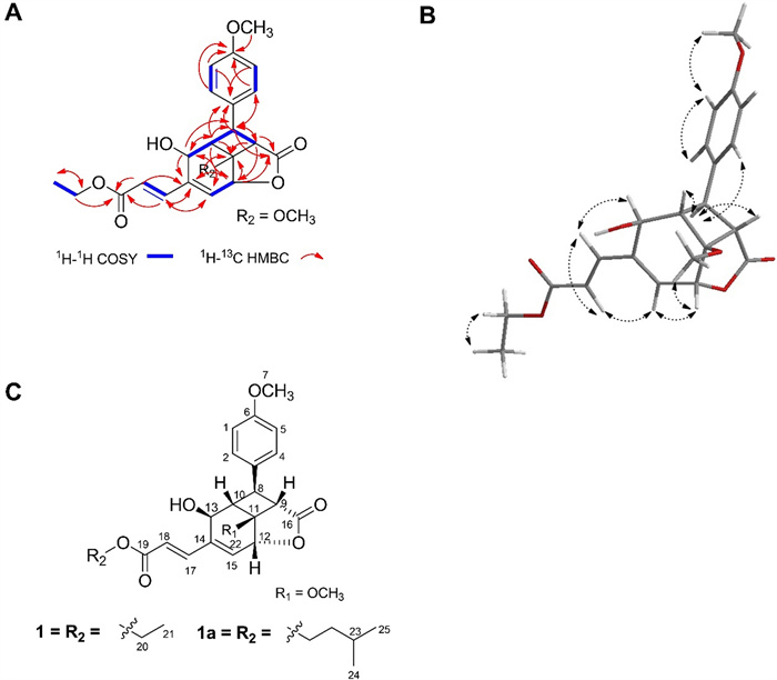 Compound 1. A 1H–1H COSY and HMBC correlations; B 1H–1H NOESY correlation; C Comparison of compounds 1 and 1a