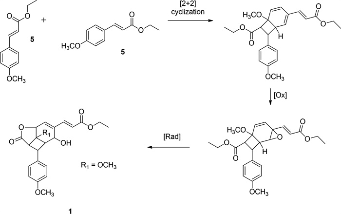 The photochemical generation of 1 a [16] provided a conceptual framework for proposing a plausible biosynthetic pathway for compound 1, a new natural product derived from K. galanga. Given that ethyl 4-methoxycinnamate is a major constituent of K. galanga, it is postulated as the precursor (Fig. 2). Exposure to natural sunlight during plant growth or post-harvest drying processes may facilitate [2 + 2] cycloaddition [21] between the trans double bond of compound 5 and the aromatic ring, followed by epoxidation and subsequent ring opening, ultimately forming the lactone through double bond migration and carboxylate conjugation. Based on its structural features and proposed biosynthesis, compound 1 can be classified as a phenylpropanoid dimer rather than a lignan, since its formation involves photochemical dimerization rather than oxidative coupling of monolignols [22].