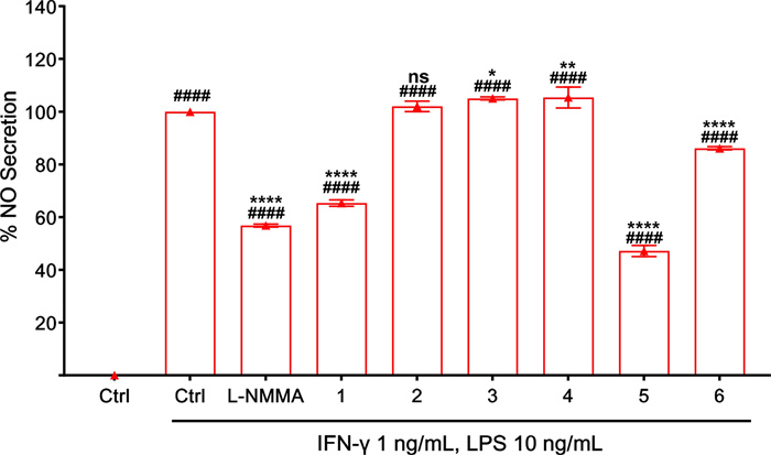 Effect of isolated compounds on NO secretion in RAW264.7 cells. Concentration of sample is 40 μM except for L–NMMA (100 μM). All the results are presented as the mean ± SD (n = 3). Statistical analysis was conducted using one way ANOVA (Tukey’s test). Significance difference (#### p < 0.0001) compared with vehicle control group, whereas (**** p < 0.0001, ** p < 0.01, * p < 0.05) compared with LPS treatment group
