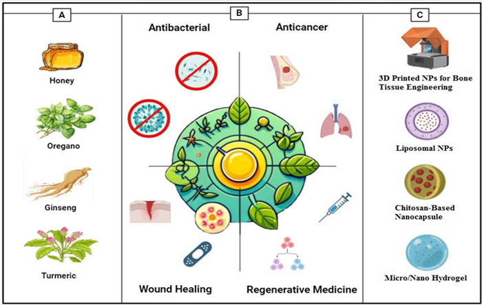 When it comes to medical therapy, wound healing is of the utmost importance, not only for the purpose of physical recovery but also for the purpose of psychological well-being [40, 41]. It is essential to provide appropriate wound care in order to avoid problems such as infections, deformed scars, and prolonged hospitalization from occurring [42]. Phenolic compounds, alkaloids, saponins, and flavonoids among the drugs demonstrated to boost collagen generation also cell proliferation and angiogenesis [43]. Especially remarkable is the evidence showing Allium sativum, Aloe vera (AV), Centella asiatica, and Hippophae rhamnoides greatly increases burn injury repair [44]. It has been demonstrated that herbal medicines that are used topically have the potential to be effective in treating burn wounds; however, additional research is required to evaluate the possibility of harmful consequences [45]. Moreover, herbal compounds have demonstrated potential in the field of tissue engineering (TE) and regeneration. Li's study found that polysaccharides produced from Chinese medicinal herbs help wounds heal and tissue damage be repaired [46]. It is commonly accepted that Chinese herbal medicines have the potential to promote adult stem cells in the process of tissue regeneration [47]. There is considerable research being undertaken on the potential applications of plant-derived biomaterials for tissue engineering [48]. Apart from motivating bone regeneration, phytochemical compounds including flavonoids, tannins, and polyphenols can be integrated into nanostructured scaffolds with the purpose of bone tissue engineering [49]. On the other hand, poor digestion and absorption lowers the efficacy of herbal remedies by insufficient active components reaching their intended purpose. Moreover, at appropriate dosages, herbs could be allergenic or poisonous, thereby impairing organs or causing nausea or vomiting [50, 51]. Bettering delivery methods will help to make herbal medicines safe and efficient for life-threatening diseases. Using nanodelivery technologies more focused and less side effects treatment solutions are accessible [52]. NPs based on proteins, lipids, or polysaccharides can show antimicrobial effect; regardless of their basis [53]. This is accomplished by creating osmotic stress in microbial cells, which increase membrane permeability [51]. Including NPs into various carriers, including hydrogels, increases their adhesion to the surfaces of tissues, so enabling highly concentrated treatment to be more realistic [54, 55]. While albumin-based nanocarriers enhance drug absorption in the body due to their widespread presence in humans and excellent biocompatibility, cellulose-based NPs improve the morphology of delivery vesicles and enhance their high cytocompatibility [56, 57]. It is possible to preserve herbal compounds against degradation using nano-delivery carriers such as nanoemulsions and liposomes, which also ensure great bioavailability and biocompatibility [58]. Figure 1 offers a schematic representation of the report's content. Panel A illustrates commonly used plants and natural compounds with bioactive properties. Panel B outlines the main applications, spanning antibacterial, anticancer, wound healing, and regenerative medicine. Panel C highlights the main delivery systems employed in herbal medicine research.