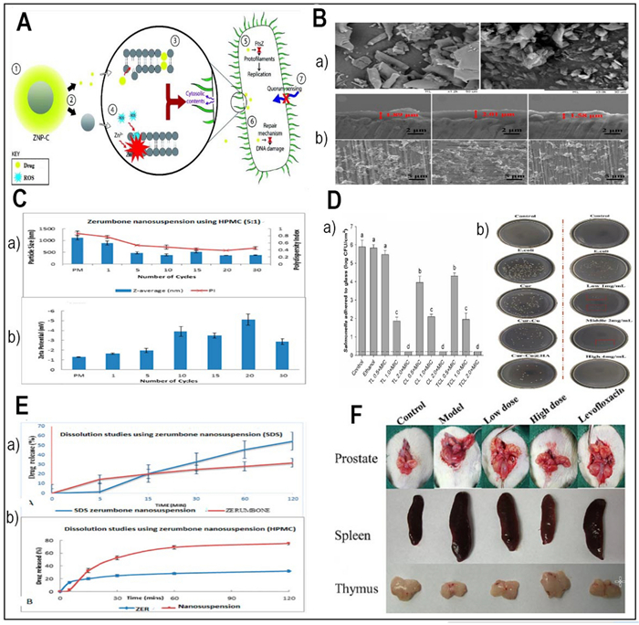 A The synergistic impact of the nanocarrier-drug combination on bacteria (Redesigned from reference [89] with permission). B SEM images of freeze-dried nanosuspensions containing SDS-zerumbone (Left) HPMC-zerumbone (Right) (Redesigned from reference [86] with permission). C The particle size and size distribution (measured as polydispersity index (PI) (a) and the zeta potential (b) of zerumbone nanosuspensions stabilized by HPMC decrease with increasing homogenization cycles (Redesigned from reference [86] with permission). D Effects of encapsulated antimicrobials, after a 1-min contact with Salmonella adhered to glass surface (a) (Redesigned from reference [95] with permission), The plate colony images of ALL@CS incubating with E. coli for about 4 h (b) (Redesigned from reference [101] with permission). E The dissolution profiles of (a) a freeze-dried nanosuspension stabilized by SDS and (b) a freeze-dried nanosuspension stabilized by HPMC were evaluated in a phosphate buffer solution at pH 7.4 and a temperature of 37 ℃ [86]. F The therapeutic efficacy of Cur-Cu@HA for prostatitis in rats. Images of the prostate, spleen, and thymus in various categories.(Redesigned from reference [101] with permission). (p-value = p, *p < 0.05, **p < 0.01, *** p < 0.001)
