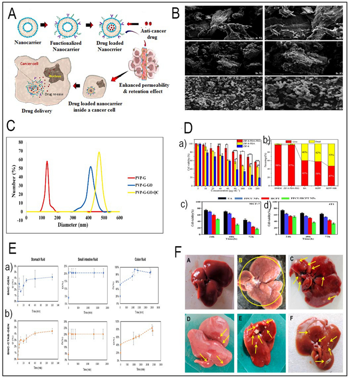 A Illustration of nanocarrier targeting, binding, internalization, and drug release in cancer therapy (Redesigned from reference [127] with permission). B SEM images of PEC, PEC-CUR and PEC-T-CUR. Scale bars of 100 μm (images in the left, magnification ×1000) and 50 μm (images in the right, magnification ×2000) (Redesigned from reference [138] with permission). C DLS analysis and the size distribution of PVP-G, PVP-G-O and PVP-GGO-QC nanocomposite (Redesigned from reference [151] with permission). D (a) Cell viability of ZIF-8, ZIF-8-PDA, ZIF-8-PDA-PEG and A549 cells after incubation for 24 h (Redesigned from reference [149] with permission). (b) Survival area of A549 cells treated with DMEM, ZIF-8-PDAPEG, free BA, BZPP, BZPP + NIR for 24 h (BA concentration: 20 μgmL−1) (Redesigned from reference [149] with permission). (c) Cell viability of MCF-7 and (d) 4T1 cells dealt with different groups was detected by CCK-8 assay (Redesigned from reference [197] with permission). E (a, b) The release profile of genistein within gastrointestinal fluids (Redesigned from reference [185] with permission). F Representative illustrations of rat liver specimens: A the typical group of liver tissue exhibits a normal appearance, showing no macroscopically detectable pathological alterations. B The disease control group's liver tissues exhibited notable alterations in terms of hue, texture, and consistency. The tissue displayed a pallid pink coloration along with enlarged dimensions and a wrinkled surface adorned with numerous visible nodules (indicated by yellow arrows). C Prophylactic RS treated group demonstrated very few nodules (yellow arrows) and lesions. D Prophylactic RL5 treated group in rats showed marked reduction in the number of nodules and damaged caused by NDEA. E, F Therapeutic RS and RL5 treated groups in rats showed reduction in the number of nodules (Redesigned from reference [165] with permission). (p-value = p, *p < 0.05, **p < 0.01, *** p < 0.001)