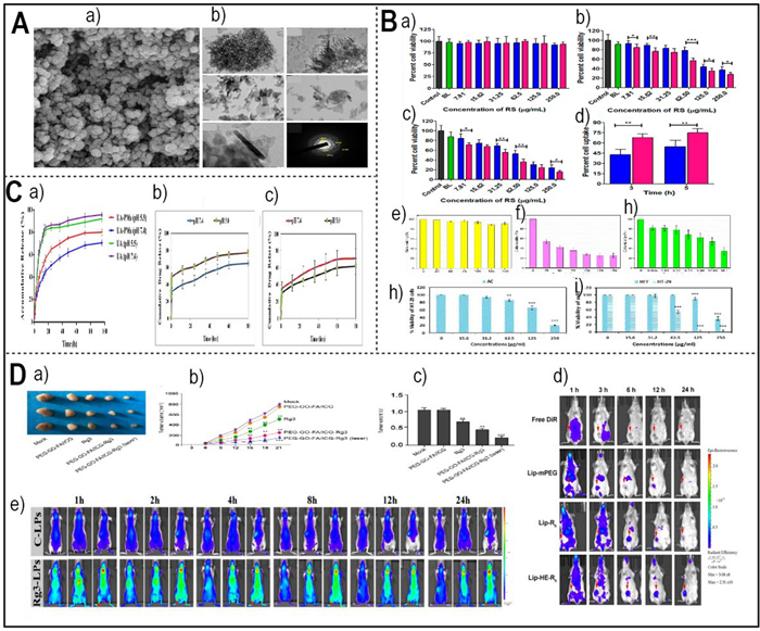 A a) FE-SEM images of Cur–Art NioNPs (Redesigned from reference [164] with permission). (b) TEM photos show the magnification levels of ×40000, ×40000X, ×80000, ×80000, ×200000, and a SAED pattern (Redesigned from reference [175] with permission). B (a) The cytocompatibility of RS and RL5 was assessed by measuring their cytotoxicity against normal mouse fibroblast cell lines (L929) using the colorimetric MTT test (Redesigned from reference [165] with permission). (b, c) The cytotoxicity of BL, RS, and RL5 on HepG2 cell lines was assessed over 24 and 48 h. Cell viability was measured using the MTT test at various drug doses (Redesigned from reference [165] with permission). (d) A bar graph illustrating the quantitative cell internalization of RS and RL5 in HepG2 cancer cells. The evaluation was conducted at 3 and 5 h time intervals using HPLC (Redesigned from reference [165] with permission). An in vitro cytotoxicity analysis of the BSA NPs (e), pure BER (f), and BER–BSA NPs (g) against the LN229 cell line following 24 h incubation (Redesigned from reference [160] with permission). (h) MTT assay. A Decreased HT-29 cell viability in AC treatment (Redesigned from reference [75] with permission). (i) MTT assay. comparison of growth inhibition of HT-29 cancer cells compared to HFF in AC-PLCF-NPs treatment (Redesigned from reference [75] with permission). C (a) The in vitro cumulative release profile of ursolic acid (UA) from polymeric micelles loaded with UA (UA-PMs) in a phosphate-buffered saline (PBS) solution at pH 7.4 or pH 5.5, and at a temperature of 37 ℃, is compared to the release profile of free UA (Redesigned from reference [152] with permission). Drug release kinetics of (b) EGCG and (c) Rutin (Redesigned from reference [158] with permission). D (a) Representative images of dissected tumors from nude mice are presented (Redesigned from reference [174] with permission). (b) The average tumor volume is calculated and shown (Redesigned from reference [174] with permission). (c) The average tumor weight is calculated and shown (Redesigned from reference [174] with permission). (d) The in vivo imaging of 4 T1 tumor bearing mice after intravenous injection of free DiR, DiR loaded Lip-mPEG, Lip-R6, and Lip-HE-R6 (Redesigned from reference [167] with permission). (e) In vivo fluorescence imaging of C6 orthotopic glioma bearing nude mice treated with DiR-loaded Rg3-LPs at different time points (Redesigned from reference [169] with permission). (p-value = p, *p < 0.05, **p < 0.01, *** p < 0.001)