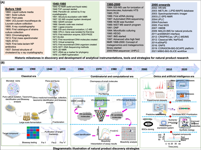 Progress time trend in hallmark tools and strategies workflow for accelerating natural product discovery (NPD). A Significant discoveries time of instruments, databases and dereplication tools in NPD research. B Time trend in isolation techniques majorly, ancient to late-twentieth century period (Top-Down Approach), late 20th to early 21th century period (Virtual Screening, High Throughput Screening and Combinatorial-/biosynthesis) and modern early 21th century to now (Omics, Artificial Intelligence and Bottom-Up Approach)