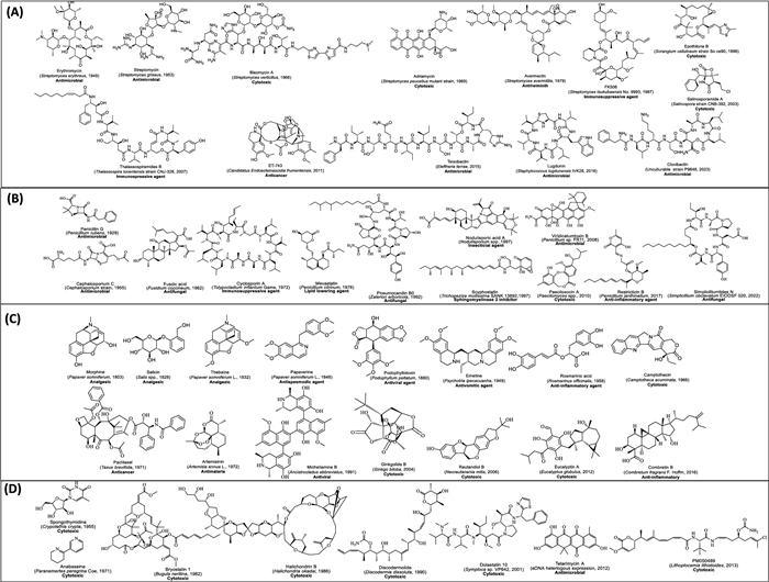 Representative revolutionary natural product discovered during the 1800–2023, usually in every decade. A Natural products (NPs) isolated from bacterial source, B NPs isolated from fungal source, C NPs isolated from plant source and D NPs from miscellaneous sources. Each metabolite is listed with its name, source of first-time isolation (provided in parentheses), and biological activity (highlighted in bold)