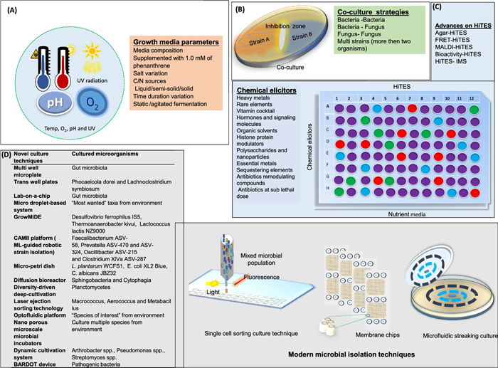 Culture modulating and untapping the unexplored reservoirs techniques. A Physical and chemical methods B Co-culture strategies. C HiTES experiment. D Examples of modern microbial cultivation techniques