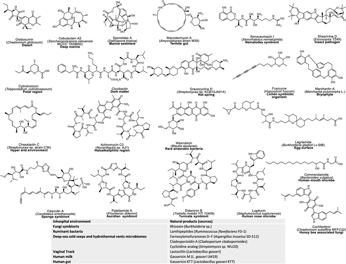 Representative examples of natural product from untapped and exotic environments. Each chemical structure is accompanied by its name, and source organism (provided in parentheses), along with the organism's exotic habitat, which are highlighted in bold