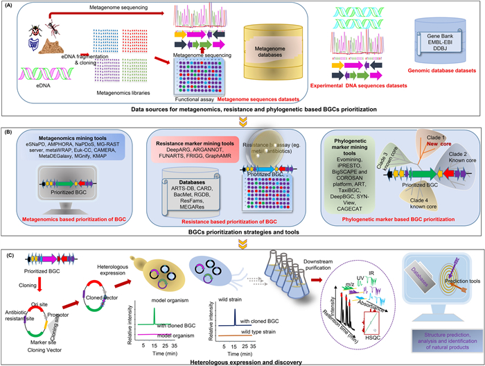 Schematic workflow and tools for genomic strategies in natural product discovery. Phylogenetic based mining, metagenomics based mining, and resistance gene based mining A Data sources; B Mining tools and databases and C Cloning, heterologous expression and identification of metabolites)