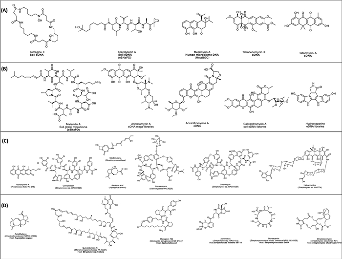 Examples of representative examples of natural products (NPs) discovered with different genomic mining approaches. A Examples of NPs discovered via metagenome mining B Examples of NPs isoalted by resistance gene mining, C Examples of NPs discovered via phylogeny-inspired mining and D heterologous expression based discovered NPs. Each chemical structure is provide with its name, sources or tools/expression system applied