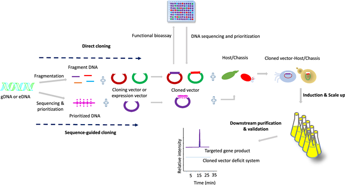 Direct cloning (Fig. 7), where fragmented environmental or genomic DNA is immediately inserted into expression vectors without prior sequencing. These vectors are then used to construct large libraries, which are screened through in vivo or in vitro functional assays to identify bioactive compounds or novel biosynthetic pathways. This strategy is particularly valuable when genomic information from the native host is poorly characterized or unavailable. By bypassing the need of prior sequence information, sequence-independent approaches enable comprehensive exploration of a sample genetic content, often increasing the likelihood of capturing entire BGCs and uncovering structurally novel NPS.