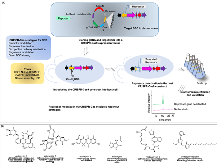 Several hallmark studies illustrate the breadth of CRISPR-Cas applications in NPD. For example, Bushin et al. [249] identified a quorum-sensing, regulated RiPP gene cluster from Streptococcus cloned using CRISPR-assisted and expressed the cluster in S. albus, leading to the production of of streptosactin, a sactipeptide with unique crosslinks and strong antifungal activity against Candida albicans and Aspergillus fumigatus. Ameruoso et al. [250] developed CRISPR interference (CRISPRi) and activation (CRISPRa) systems in Streptomyces venezuelae to regulate transcription of silent biosynthetic gene clusters. By modulating key regulatory networks, they successfully activated the jadomycin B cluster, leading to natural product synthesis previously undetectable under standard conditions. Likewise Peng et al. [251] constructed a CRISPR-dCas9 system in Myxococcus xanthus, enhancing epothilone B production. By fusing dCas9 with a transcriptional activator and targeting promoter regions of the 56-kb biosynthetic gene cluster, they achieved a 6.8-fold yield increase. These three examples illustrate the successful application of CRISPR-Cas technology in distinct areas of natural product research: the discovery of new compounds, activation of silent gene cluster and the scalable production of valuable metabolites. Figure 8B presents examples of NP modulated using CRISPR-Cas technology.