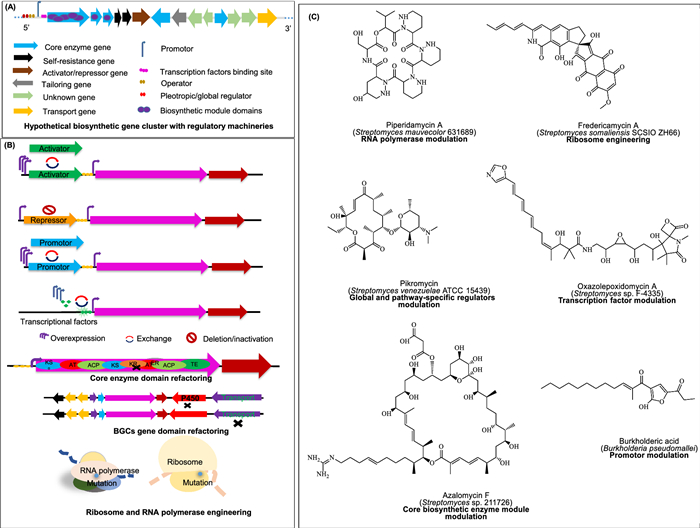 Metabolic engineering strategies for fine-tuning biosynthetic gene cluster domains A A schematic diagram for hypothetical BGC. B Different metabolic strategies applied to activate BGCs. C Examples of NPs discovered viz-metabolic modulation strategies. Each metabolite is provided with its name, source and strategy applied