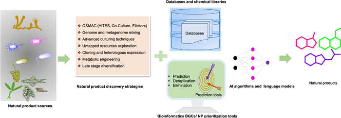 Amid this backdrop, cutting-edge "bottom-up approaches" including multi-omics technologies, hyphenated analytical techniques, and bio-/cheminformatics platforms, offer exciting avenues for accelerating the novel carbon skeletons or NCEs discovery. Coupled with advanced mass spectrometry (MS)/ nuclear magnetic resonance (NMR)-based dereplication methodologies and databases (Table 1), which swiftly filter known compounds and eliminate redundancy, these innovations enable precise targeted exploration of unique metabolites [17]. This era is often regarded as a "new golden period" or "muti-omics AI era" for NPs-based drug discovery and development [18]. Concomitantly, the rapid surge of NPs, with approximately 6–7 million standardized and centralized in public databases such as Dictionary of Natural Products, COlleCtion of Open Natural prodUcTs, Natural Product Atlas (Table 1A), accounts for only 1/10th of the total NPs chemspace [2]. Yet, specialized metabolites produced in low concentrations (often less than 1% by weight) in complicated cellular compartments, a time-consuming dereplication process, silent or incomplete biosynthetic domains nature of biosynthetic gene clusters (BGCs) remain major challenges [19].