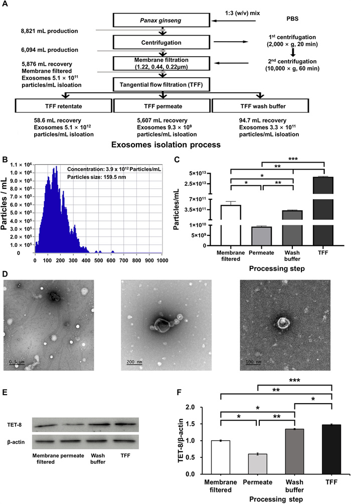Sequential membrane filtration and tangential flow filtration (TFF)-based purification of Panax ginseng-derived exosomes. (A) Particle size distribution and concentration measured using nanoparticle tracking analysis. (B) Quantification of exosome yield at each purification step. (C. Transmission electron microscopy images of P. ginseng-derived exosomes. (D) E Evaluation of biomarker expression by Western blot. Quantification of F TET-8 expression levels in P. ginseng-derived exosomes
