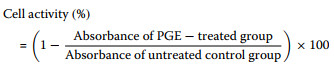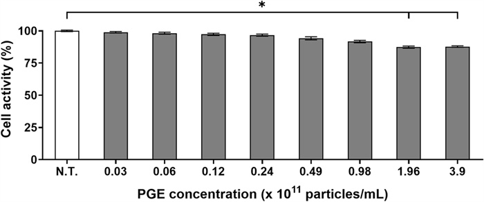 Cell activity was assessed based on the reduction of 3-(4,5-dimethylthiazol-2-yl)-2,5-diphenyltetrazolium bromide (MTT). To evaluate changes in cell activity, 3T3-L1 cells cultured under identical conditions were treated with PGE (0.0–3.9 × 1012 particles/mL) and incubated for an additional 24 h. Subsequently, 0.6 μM MTT solution was added and incubated for 4 h, after which the resulting formazan crystals were dissolved in dimethyl sulfoxide. The absorbance was measured at 450 nm using a microplate reader (AMR-100, Allsheng, Hangzhou, Zhejiang, China), and cell activity was expressed as a percentage according to Eq. 1.