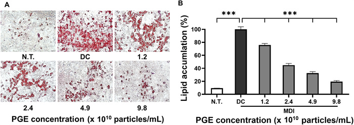 As shown in Fig. 3, the differentiated control (DC) group exhibited substantial lipid droplet formation, with overall lipid accumulation increasing by 278.3% compared to the N.T. control. This was accompanied by marked enlargement in droplet size and density. In contrast, PGE-treated groups demonstrated a progressive reduction in lipid accumulation, with the highest concentration group showing only fine droplets or droplets of relatively low-density. Quantitative analysis (Fig. 3B) revealed that lipid accumulation in the PGE-treated groups decreased by 23.4%, 36.7%, and 63.5% at 1.2 × 1010particles/mL, 2.4 × 1010particles/mL, and 4.9 × 1010 particles/mL, respectively, when compared with the DC group, confirming a significant dose-dependent inhibitory effect (p < 0.01). Notably, treatment with PGEs at 9.8 × 1010 particles/mL produced a 64.7% reduction in lipid accumulation, representing the strongest inhibitory effect observed, which was attributed to the suppression of fatty acid synthesis and adipocyte differentiation, thereby inhibiting lipid droplet formation.