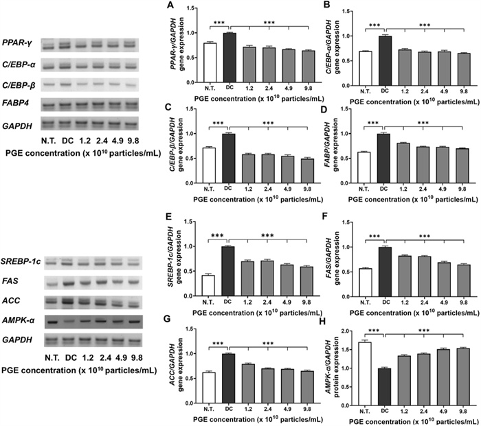 Evaluation of anti-obesity related gene expression in 3T3-L1 following treatment with Panax ginseng-derived exosome. Expression levels of PPAR-γ (A), C/EBP-α (B), C/EBP-β (C), FABP4 (D), SREBP-1c (E), FAS (F), ACC (G), and AMPK-α (H) gene levels, quantified relative to GAPDH