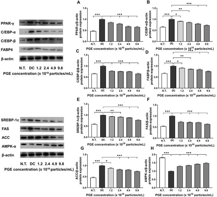 Evaluation of anti-obesity related protein expression in 3T3-L1 following treatment with Panax ginseng-derived exosome. Expression levels of PPAR-γ (A), C/EBP-α (B), C/EBP-β (C), FABP4 (D), SREBP-1c (E), FAS (F), ACC (G), and AMPK-α (H) protein levels, quantified relative to β-actin