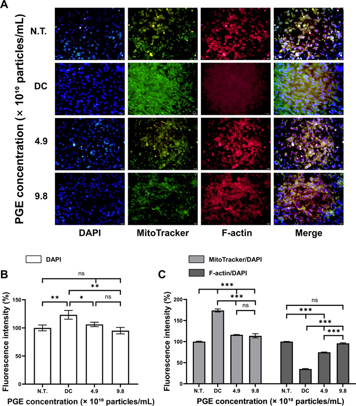 Immunofluorescence analysis of 3T3-L1 treated with Panax ginseng-derived exosomes. (A) Confocal images showing nuclei (DAPI, blue), MitoTracker (green), and F-actin (red). (B) Quantification of fluorescence intensity for DAPI. (C) Relative fluorescence intensity of MitoTracker and F-actin normalized to DAPI. Scale bars = 20 μm