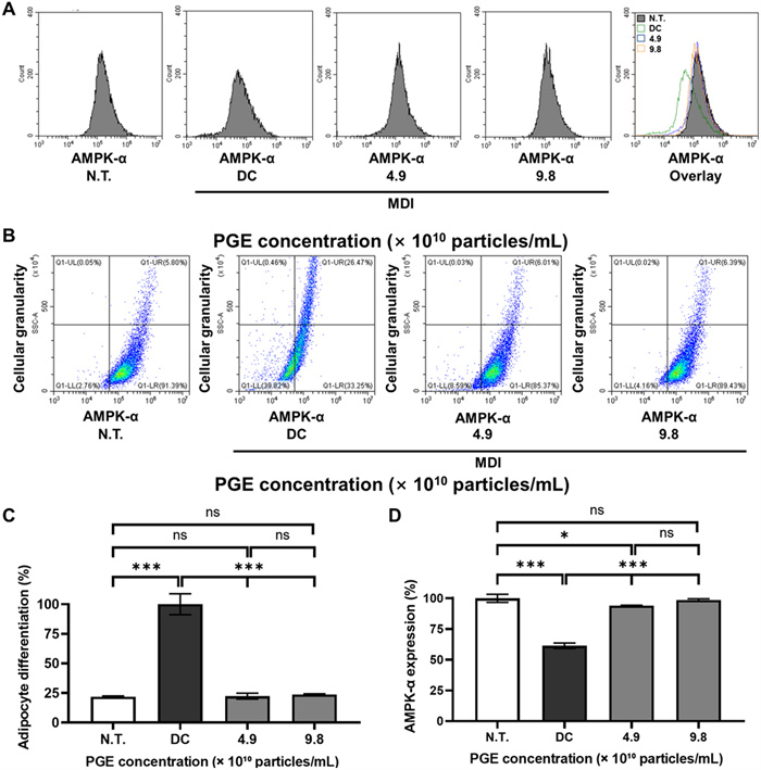 Effects of Panax ginseng-derived exosomes (PGE) on AMPK-α expression and adipocyte differentiation in 3T3-L1 cells. (A) Flow cytometry histograms showing AMPK-α fluorescence intensity in N.T., DC, and PGE-treated groups. (B) Representative dot plots indicating changes in AMPK-α expression versus cellular granularity. (C) Quantification of adipocyte differentiation normalized to DC (100%). (D) Quantification of AMPK-α expression normalized to N.T