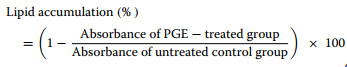 Lipid accumulation is characterized by an increase in both the size and number of lipid droplets, which are spherical non-membranous organelles formed by the intracellular deposition of neutral lipids, and serves as a representative indicator of adipogenic differentiation in preadipocytes such as 3T3-L1 cells [12]. The extent of lipid accumulation was quantified by Oil Red O staining, which selectively stains intracellular neutral triglycerides accumulated during differentiation. After treatment of 3T3-L1 cells with PGE (0.0–9.8 × 1010 particles/mL) and an additional 24 h of incubation, cells were fixed with 10.0% (v/v) formaldehyde for 30 min and stained with Oil Red O solution for 60 min. The morphology of lipid droplets and the degree of neutral lipid accumulation were visualized under an optical microscope (CX43, Olympus, Tokyo, Japan), and the bound dye was subsequently eluted with 99.5% (v/v) isopropanol. The absorbance was measured at 497 nm, and lipid accumulation was expressed as a percentage according to Eq. 2.