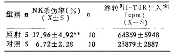 小鼠受照后24小时,其脾细胞对ConA刺激转化率明显高于对照组,NK细胞活性也明显增强(P < 0.01)(见表 3)。