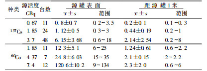 由表 1、表 2可知, 物位计等源罐表面平均剂量率随活度增大而增高。在相同条件下, 60Co的剂量率大于137Cs的。不同活度137Cs密封源铅罐表面和距源罐一米处剂量率平均值分别在0.8~6.2μGy·h-1之间和0.2~2.1μGy·h-1之间, 而60Co的剂量率平均值分别在12.3~120.6μGy·h-1之间和1.2~2.3μGy·h-1之间。