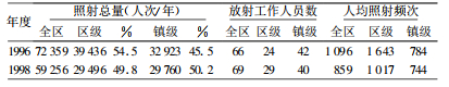 2 结果与分析 2.1 基本情况我区1996年总人口1 073 722人, 1998年总人口为1 086 951人。1998年全区从事X射线诊断的单位29个, 500 mA X射线机2台, 200 mA X射线机26台, 50 mA X射线机2台, CT 2台, 放射工作人员共69名。
