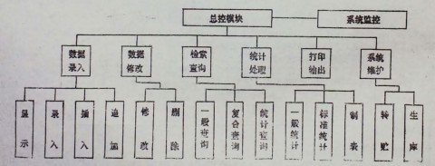 一 《系统》的设计与结构该《系统》以汉字FOXBASE PLUS为开发工具,适用于浪潮05系列,IBM及其兼容机系列。FOXBASE PLUS与目前国内流行dBASE Ⅲ关系数据库管理系统完全兼容,但在平均速度上快于dBASE Ⅲ5.9倍,而且功能上有许多重要的扩充和增强。它的适用环境宽、灵活性大。该系统是针对一个中型数据库的管理系统。数据库共有字段378个。根据数据库设计原理,把整个数据库按功能和层次分为20个子库,以个人编码作为关联。该系统采用模块化设计思想,以提高程序的通用性和操作性为根本。该《系统》结构按功能分,共有八个部分(如下图)。总控模块设置了口令,防止非法用户侵入。