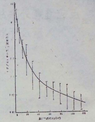 (二) 尿排出率的动态变化图 2绘出了33例正常人尿排出率的动态变化,从中可见口服碘-131后,尿排出率很快就达到了最大值,并随服碘-131后时间急剧下降,50小时以后下降速度减慢。经曲线合式为:
