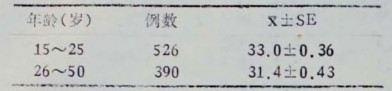 表 1列出了916例正常人[6]两个年龄组口服碘-131后24小时甲状腺蓄碘-131率,两组有显著差异(p < 0.005)。在不考虑年龄的条件下取均值而引入的组间误差约为10%。