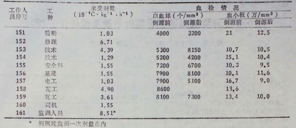 从表 1、2中可以看出,倒装钴—60源除了必要的剂量防护计算外,还应现场进行γ线的监测,以便知道工作人员所受的剂量,为此,在倒源中,采用两种仪器监测,一种是FD-71A型晶体管小型闪烁辐射仪;另一种是LiF(MgCu,P)热释光材料及热释光测量仪,每个工作人员左胸前配戴一个,仪器测得结果:最高值为源铅罐顶上部20公分处1.07×10-4C·kg-1·s-1,最低值为1.29×10-9C·kg-1·s-1;配戴个人剂量计11人中,除161号监督人员剂量大外,其余10人受照剂量范围为1.0~6.7×10-7C·kg-1·h-1,由于倒装源只此一次,剂量都为国家规定范围的1/10[1]。从表 2血液检查来看,除两人白细胞和一人血小板无变化外,其余5人都有不同程度的变化,最低为3200/mm3。根据放射人员健康管理规定第五条及第二十三条,从事放射工作人员应享受保健待遇的精神,凡参加这次倒源工作的人员,视其吸收剂量的多少,分别给予一定的保健津贴[2]。