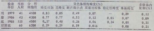 染色体检查结果列于表 1。结果表明,观察组染色体畸变细胞数、总染色体畸变数和断片加微小点数二项指标均高于对照组,有显著性差异(P < 0.05)。观察組中染色体总畸变率≥3%者,1979年组为4例(占9.8%),1986年组2例(占4.7%), 1988年组2例(占1.7%)。以上指标均呈下降趋势。双着丝粒体观察组虽高于对照组,但无显著性差异。染色单体畸变无规律性,多倍体和内复制在收集第一个周期的染色体标本中是很少见的,但在1988年组中,随机观察100个中期分裂相中,>3%者有3例,其中一例达10, 可能为其他潜在病因所致。