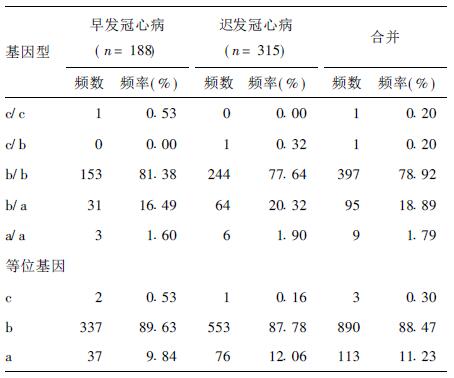 2 结果 2.1 一般情况(1)早发冠心病组男性104例, 女性84例, 性别比为1.24:1;迟发冠心病组男性221例, 女性94例, 性别比为2.35:1。早发冠心病组吸烟者73例, 吸烟率为38.8%;迟发冠心病组吸烟者92例, 吸烟率为29.2%。早发冠心病组饮酒者44例, 饮酒率为23.4%;迟发冠心病组饮酒者45例, 饮酒率为14.3%。其中性别比、吸烟率、饮酒率等差异均有统计学意义(P < 0.05或P < 0.01)。(2)2组检测指标比较:早发冠心病组收缩压/舒张压分别为(127.47±18.10)/ (79.22±11.00) mmHg; 迟发冠心病组为(131.51±23.39)/ (77.59±12.84) mmHg。早发冠心病组体质指数为(26.32±31.6) kg/m2, 迟发冠心病组为(24.96±3.69) kg/m2。早发冠心病组腰臀比为0.90±0.07, 迟发冠心病组为0.88±0.07。早发冠心病组血清甘油三酯为(2.02±1.32) mmol/L, 迟发冠心病组为(1.56±0.94) mmol/L。早发冠心病组胆固醇含量为(5.39±1.11) mmol/L, 迟发冠心病组为(5.17±1.16) mmol/L。2组的收缩压、体质指数、腰臀比、血清甘油三酯和胆固醇含量等差异均有统计学意义(P < 0.05或P < 0.01)。